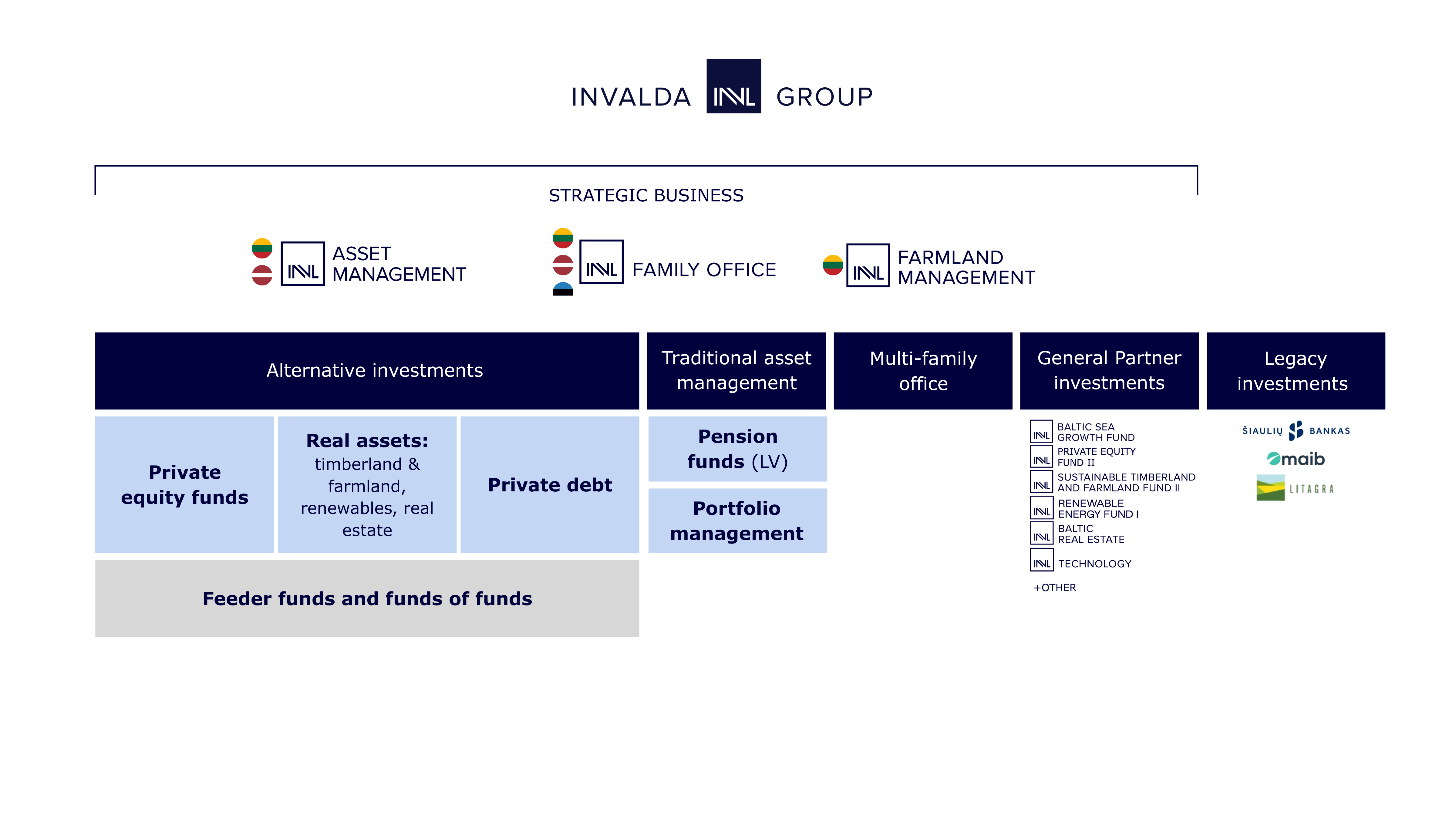 „Invalda INVL“ grupė valdo alternatyvių investicijų fondus, apimančius investicijas į privatų kapitalą, tikrąjį turtą (angl. real assets), privačią skolą. Grupės įmonės teikia šeimos biuro paslaugas Lietuvoje, Latvijoje bei Estijoje, valdo pensijų fondus Latvijoje bei investuoja į pasaulinius trečiųjų šalių fondus.